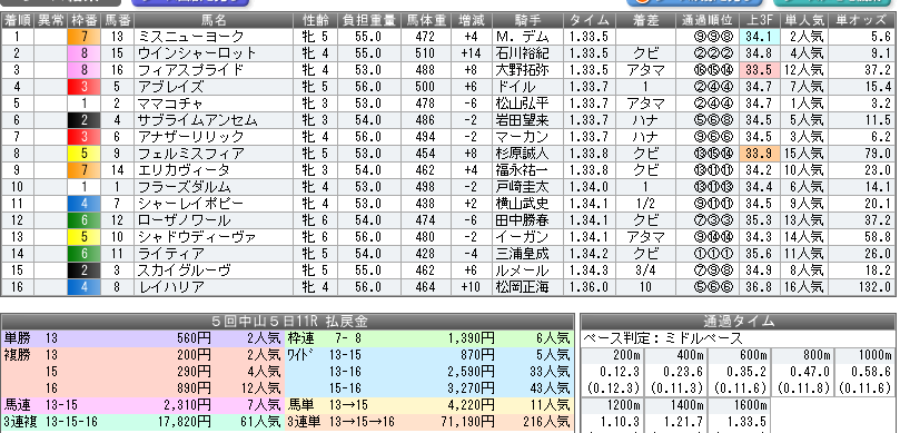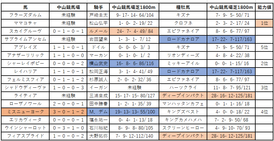ターコイズS出走馬と中山成績