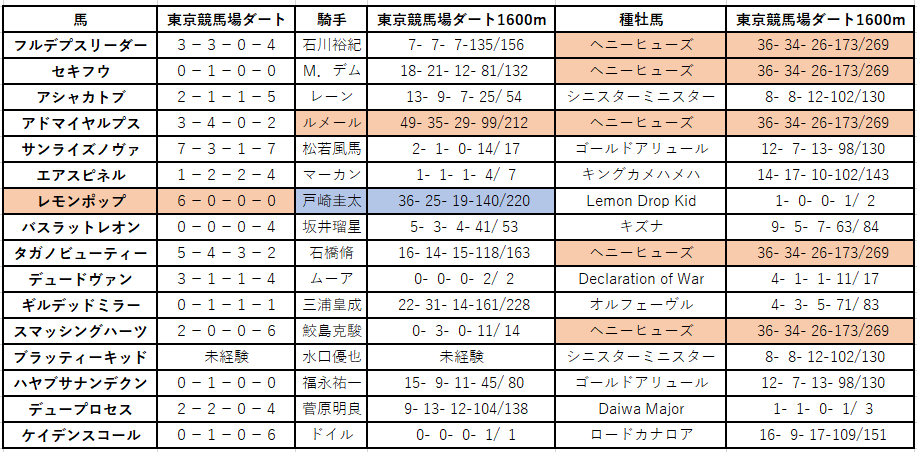 ここまで東京ダート1600mの主要ファクター(騎手・種牡馬・厩舎)が全てトップ級で揃う馬はかなり珍しい存在。